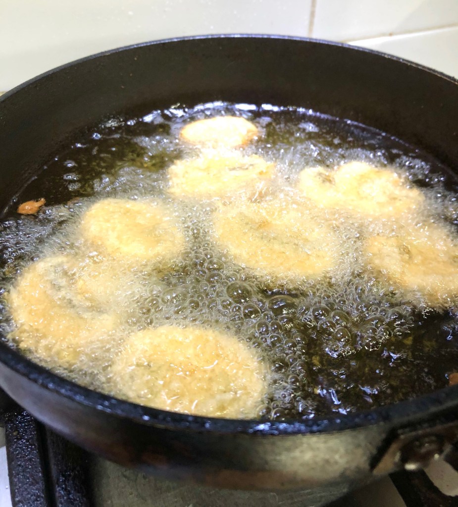 Fry the mushrooms in hot oil until they’re golden on both sides, approximately 3 minutes each side.
