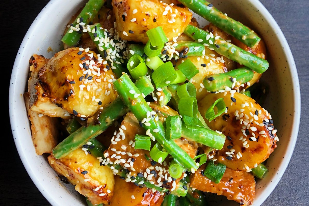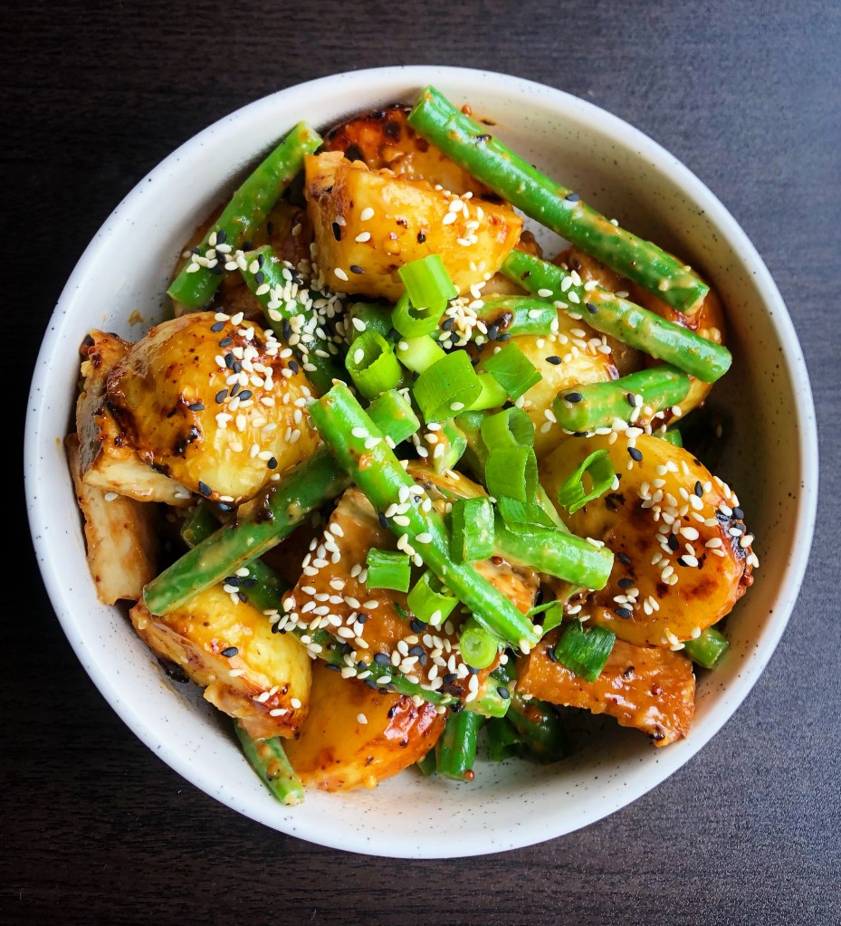 Remove potatoes and tofu from the oven. Poke potatoes with a knife or skewer- it should go in without much resistance. If they aren’t finished yet, return them to the oven in 5 minute intervals until they’re cooked. I like to pick through and remove any bigger blackened miso chunks but keep small pieces as they add flavour.