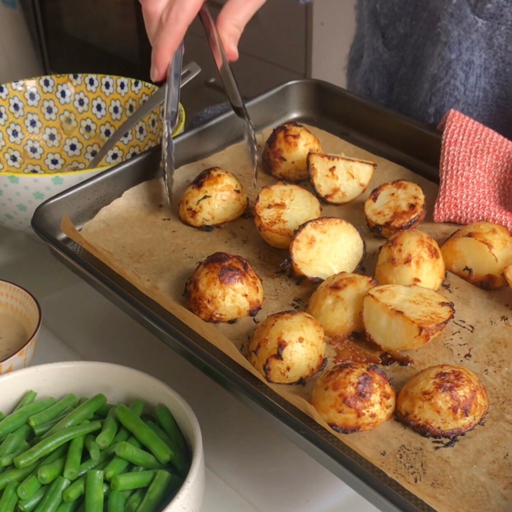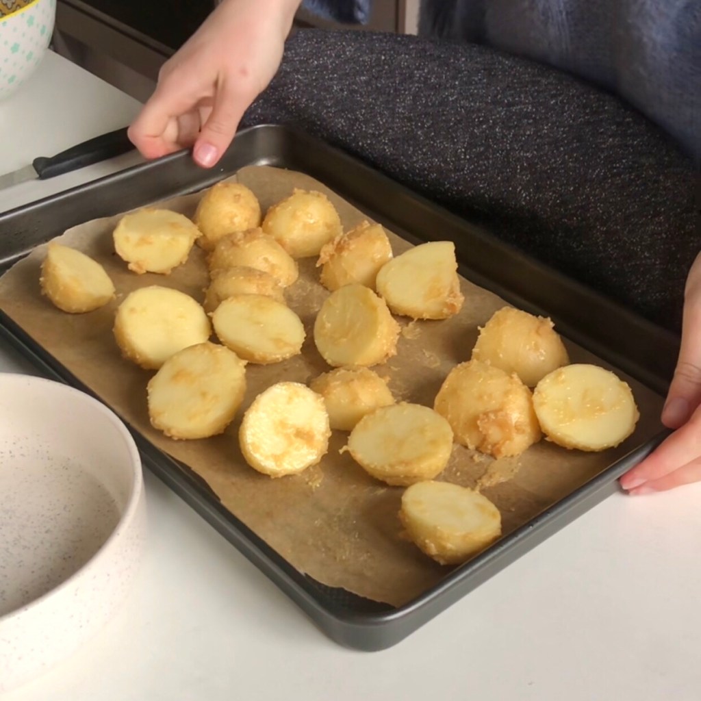 After 15 minutes, check potatoes and flip them all. There will be little blackened bits of miso which is normal. Pull the tray out and add 3 tablespoons of water to the potatoes. This will help soften them and keep the miso from burning. Put the tray back in the oven, turn down to 170C/340 for 10 minutes.