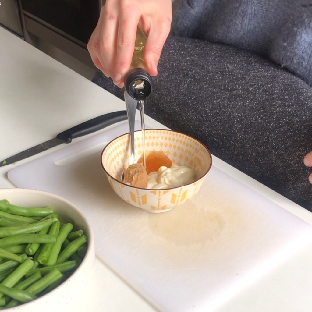 Prepare the beans by cutting off the tips on both ends and halving the beans. Set aside and boil the kettle or a pot of water.