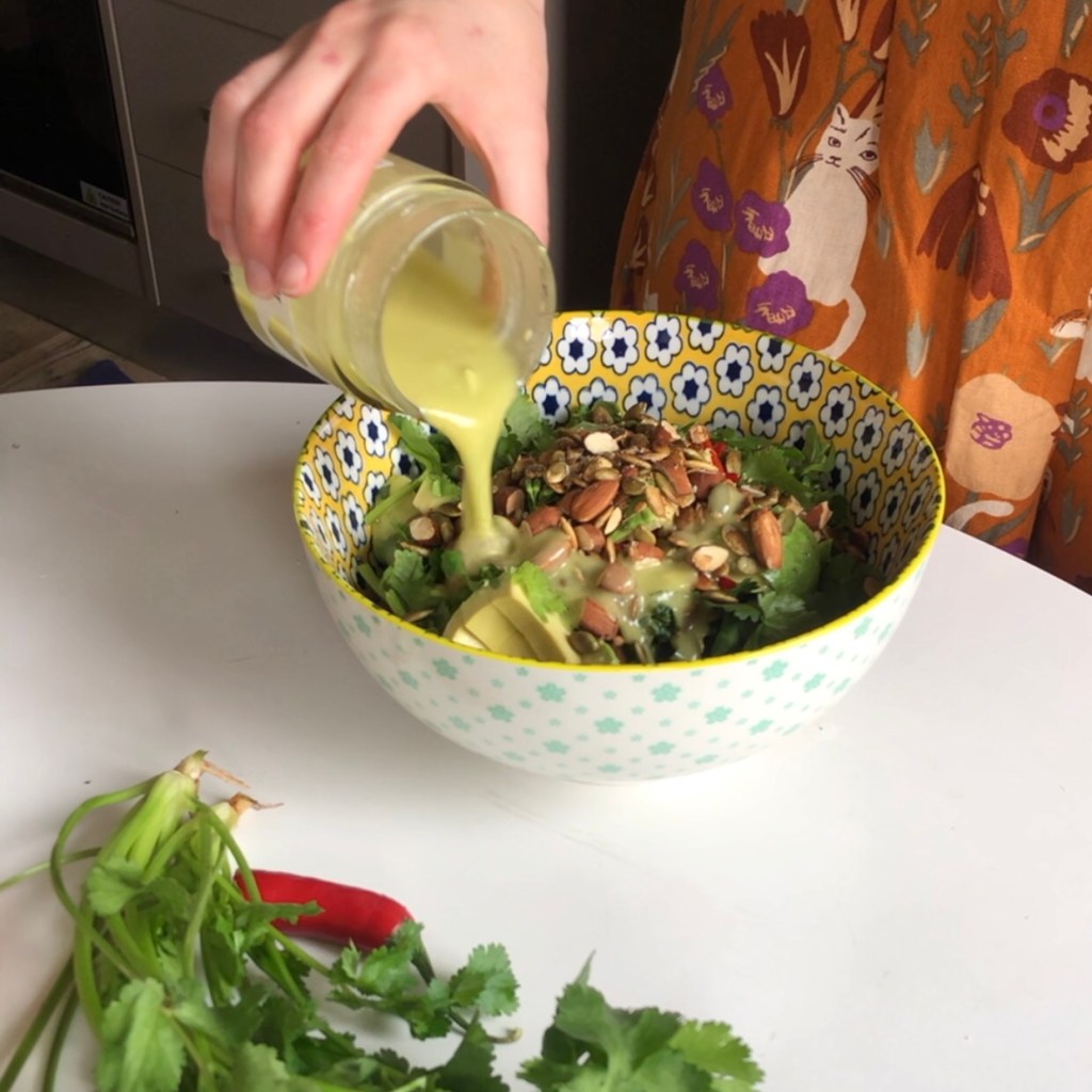 *Note: to roast your almonds, chop them roughly then add to a hot oven for 10 minutes or until medium brown in colour. To toast the pumpkin seeds, cover the surface of a frypan with the seeds and toast on medium heat until light brown, stirring regularly. Do both of these in a big batch and store in an airtight container for the next salad. It really cuts down on prep time! 🙂