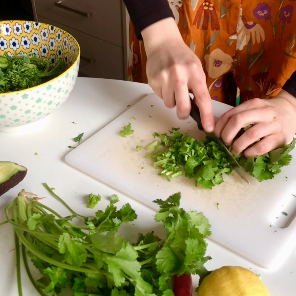 Cut the broccolini into small diagonal slices approx 1 centimetre (half inch) thick and add to a big bowl. Do the same with the coriander.